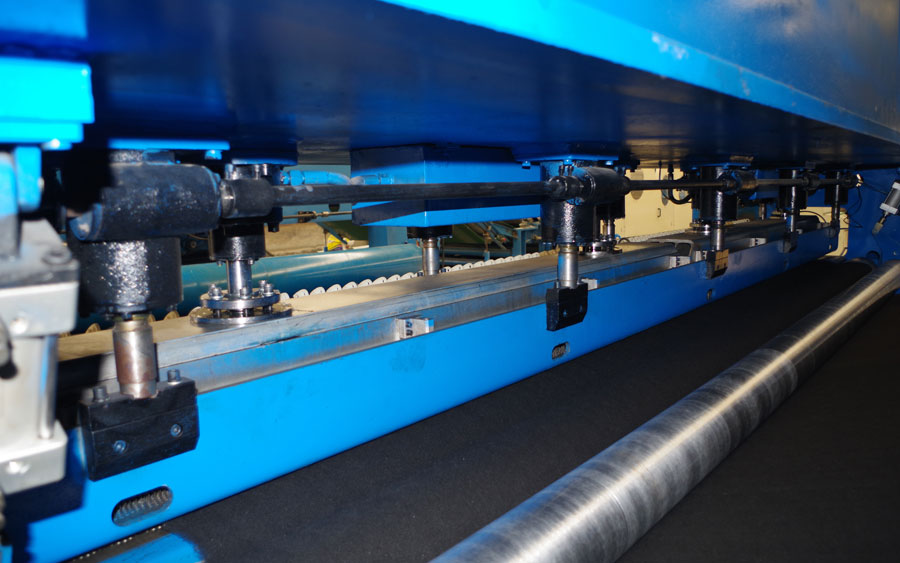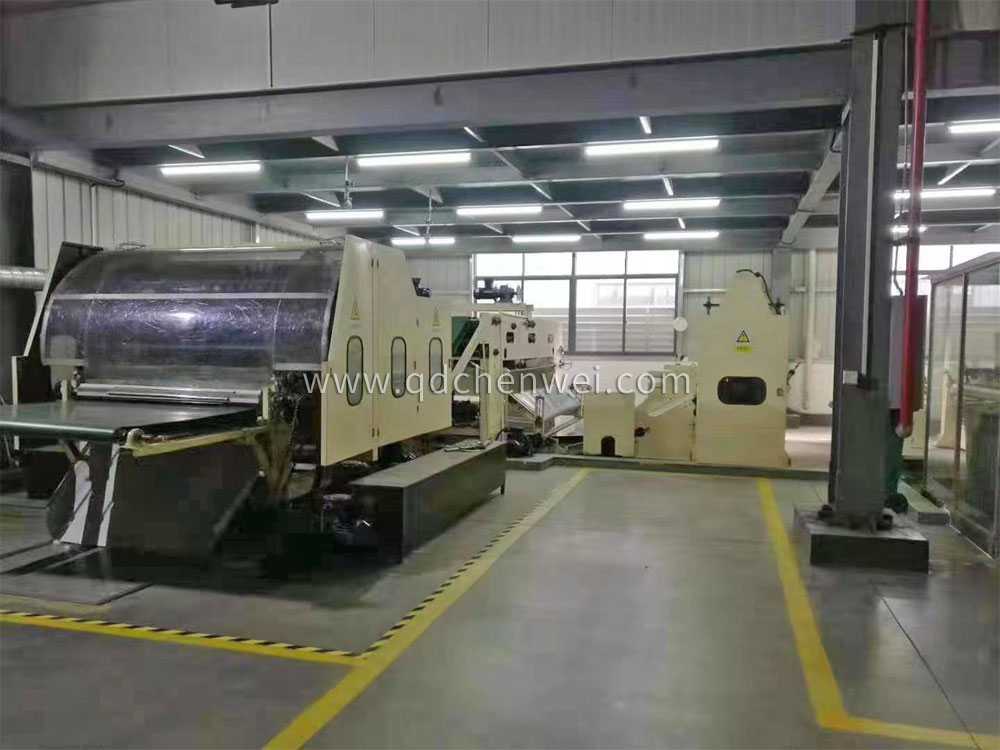 5. CWPW-鋪網(wǎng)機:用于將梳理纖網(wǎng)通過移動小車交叉折疊為所需幅寬和定量的多層纖網(wǎng),以供后道工序使用。鋪網(wǎng)輥采用特殊結(jié)構(gòu),加裝壓網(wǎng)輥和導(dǎo)流板,不飄網(wǎng)不起皺,五只大功率電機精確控制各部件的運動,電動輸出簾高度調(diào)節(jié)裝置
